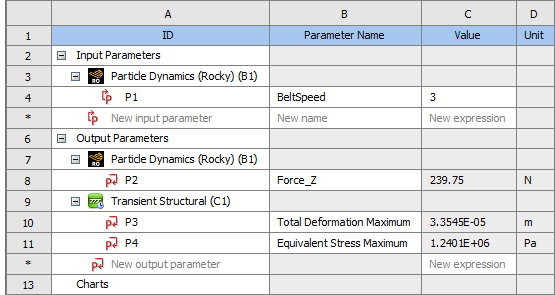 The new DPs will be run in both Rocky and Mechanical, and the resulting output parameters will be shown in this table for analysis.