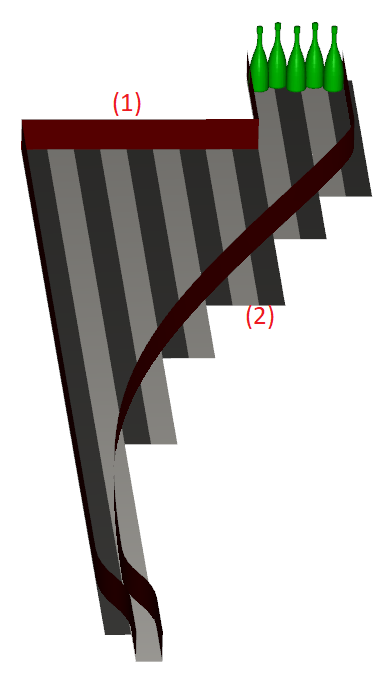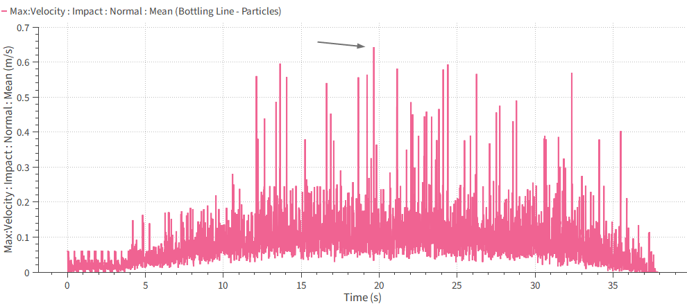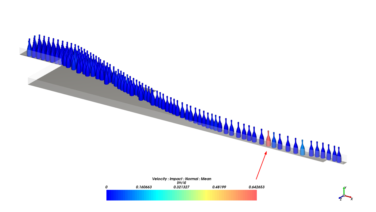 The view shows that the highest impact velocity occurs near the final "S-curve" of the rails, when the bottles are conveyed by the fastest belt.
