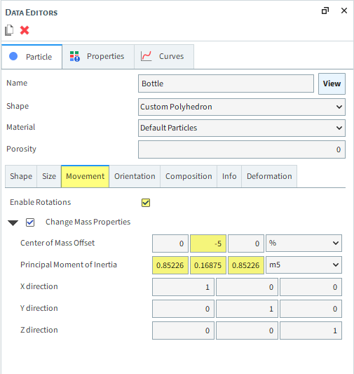 Particle Name Bottle Shape Custom Polyhedron ⯆ Select file to import Bottle.stl with "m" for Import Unit