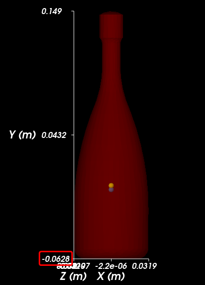 A fully upright bottle has a Y-coordinate of 0.0628 m.