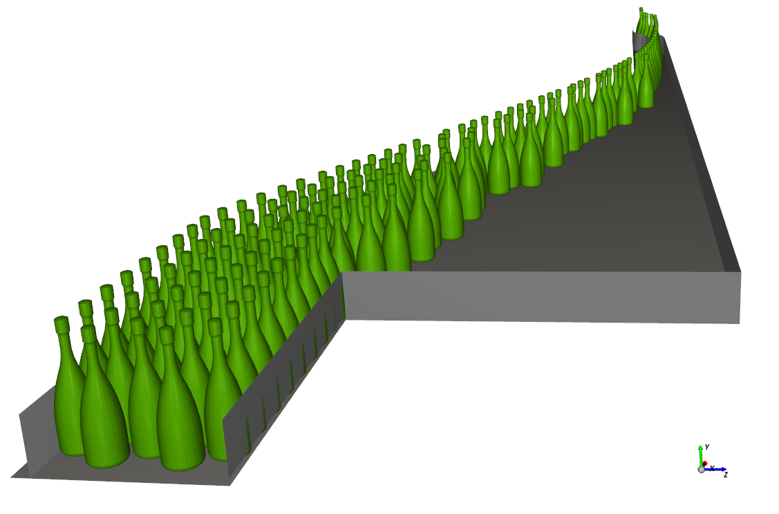 The scenario considered in this tutorial is a Bottling Line operation that transports filled champagne bottles while also consolidating them into a single line.