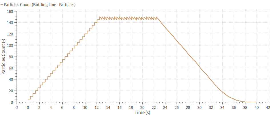 The time plot shows that between approximately 13s (when the first bottle exits the domain) and 23s (when the last bottle is injected), the amount of particles inside the domain remains stable.