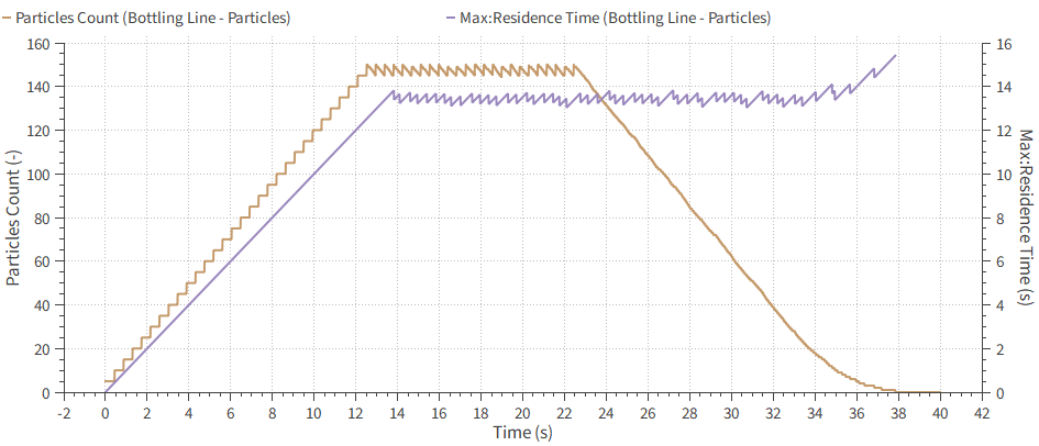 The maximum Residence Time curve shows that during the continuous operation period, each particle spent around 14s inside the domain.