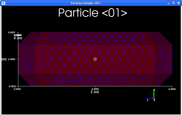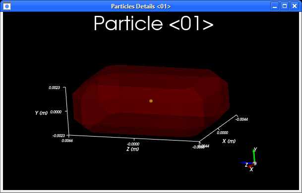 To visualize the newly created particle, click the View button. A new Particles Details window will appear showing the (transparent) particle geometry, its geometric center (yellow dot), and its center of mass (blue dot).