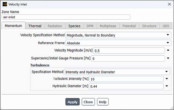 Retain the selection of incompressible-ideal-gas from the Density drop-down list.