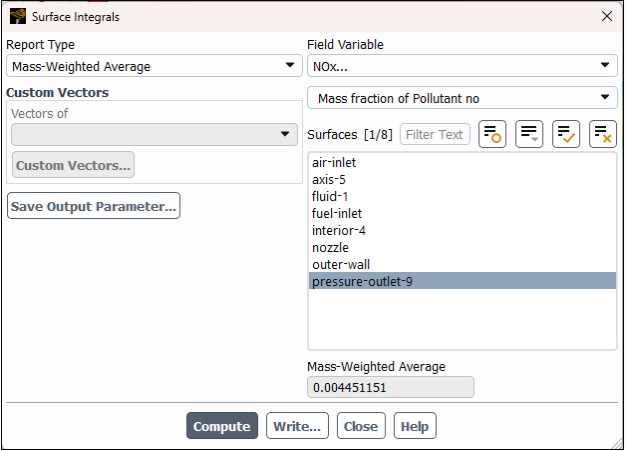 The Mass-Weighted Average field will show that the exit NO mass fraction is approximately 0.00445.