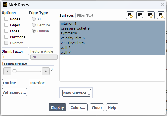 Note: You can use the right mouse button to probe for mesh information in the graphics window. If you click the right mouse button on any node in the mesh, information will be displayed in the Ansys Fluent console about the associated zone, including the name of the zone. This feature is especially useful when you have several zones of the same type and you want to distinguish between them quickly.