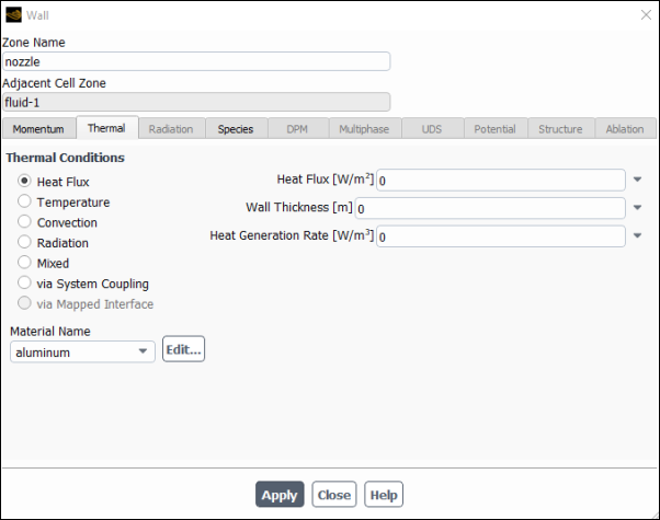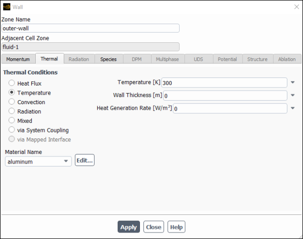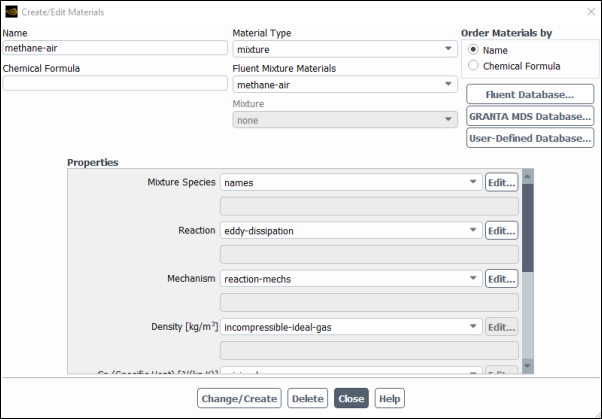 Note: The Mixture Material list contains the set of chemical mixtures that exist in the Ansys Fluent database. You can select one of the predefined mixtures to access a complete description of the reacting system. The chemical species in the system and their physical and thermodynamic properties are defined by your selection of the mixture material. You can alter the mixture material selection or modify the mixture material properties using the Create/Edit Materials dialog box (see Materials).