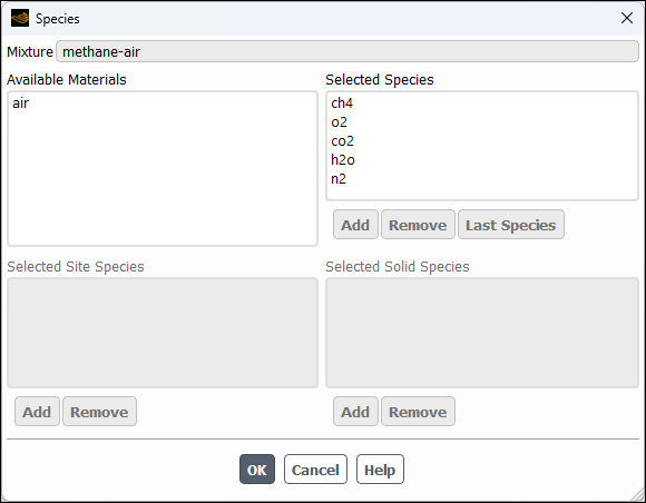 You can add or remove species from the mixture material as necessary using the Species dialog box.