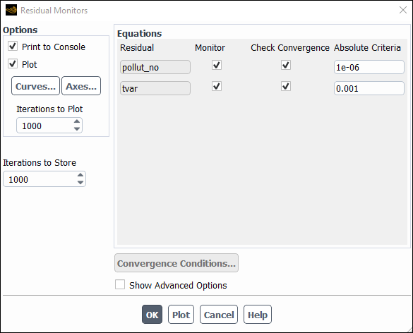 You will predict NOx formation in a postprocessing mode, with the flow field, temperature, and hydrocarbon combustion species concentrations fixed. Hence, only the NO equation will be computed. Prediction of NO in this mode is justified on the grounds that the NO concentrations are very low and have negligible impact on the hydrocarbon combustion prediction.