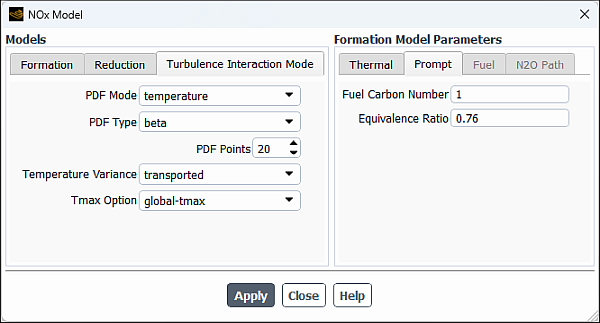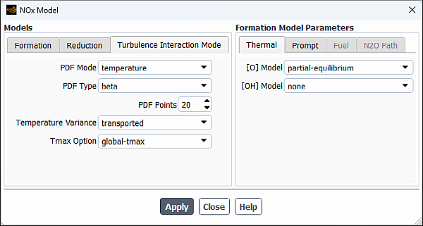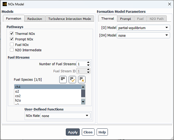 In the NOx Model dialog box, enable Thermal NOx and Prompt NOx in the Pathways group box.