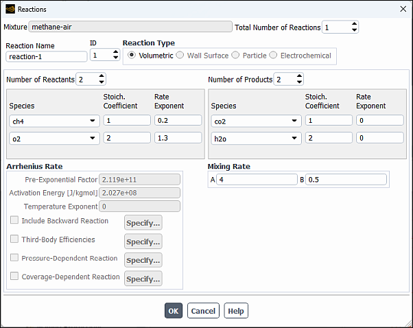 This reaction will be defined in terms of stoichiometric coefficients, formation enthalpies, and parameters that control the reaction rate. The reaction rate will be determined assuming that turbulent mixing is the rate-limiting process, with the turbulence-chemistry interaction modeled using the eddy-dissipation model.