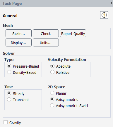 In the General task page, select Axisymmetric in the 2D Space list (Solver group box).