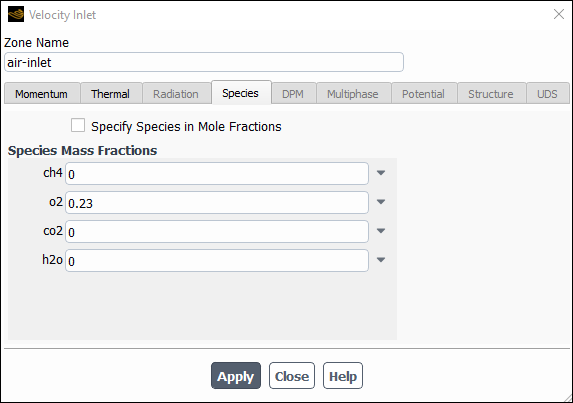 From the Fuel Species selection list, select ch4 (Fuel Streams group box).