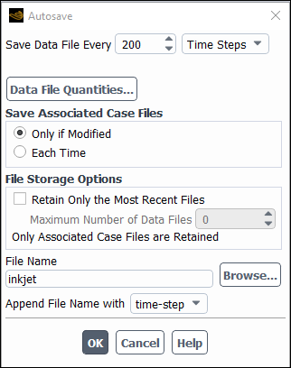 inkjet). The standard.dat.h5extension will also be appended. This will yield file names of the forminkjet-1-00200.dat.h5, where 200 is the time step number.Click to close the Autosave dialog box.