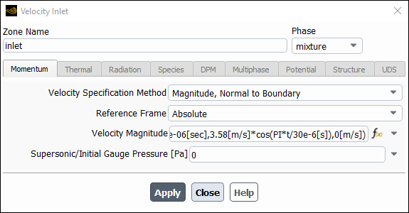 Click and close the Velocity Inlet dialog box.