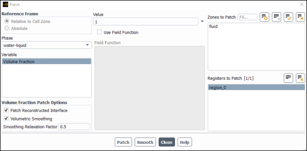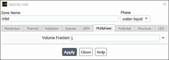 1for the Volume Fraction.Click and close the Velocity Inlet dialog box.