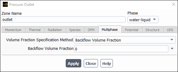 Click the Multiphase tab and retain the default setting of 0 for the Backflow Volume Fraction.