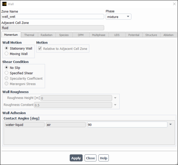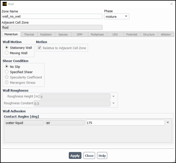 175degrees for Contact Angles [deg].Click and close the Wall dialog box.