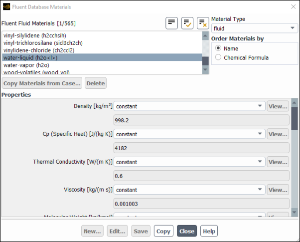 Scroll down the Fluent Fluid Materials list to locate water-liquid (h2o < l >).