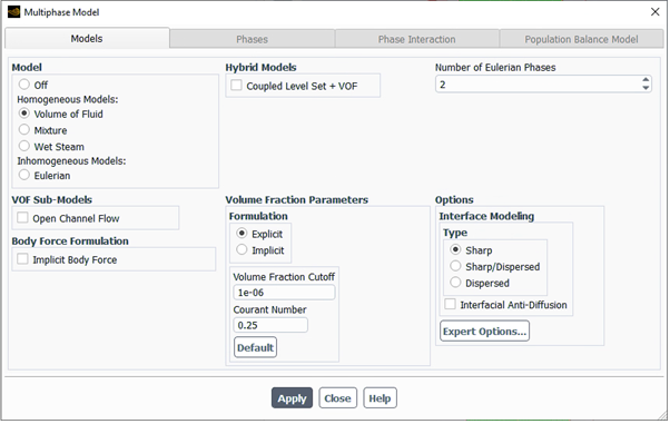 Retain the default settings and click and close the Multiphase Model dialog box.