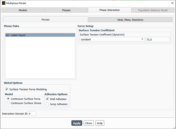 In the Multiphase Model dialog box, open the Phase Interaction tab.
