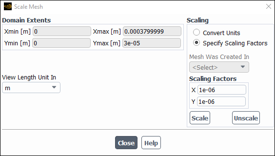 1e-6for X and Y in the Scaling Factors group box.Click and close the Scale Mesh dialog box.