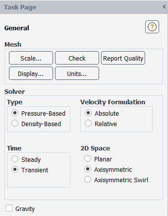 Retain the default setting of Pressure-Based in the Solver group box of the General task page.