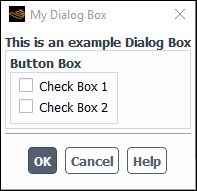 (define (apply-cb) #t) (define update-cb #f) (define checkBox1) (define checkBox2) (define isBool) (define my-dialog-box (cx-create-panel "My Dialog Box" apply-cb update-cb)) (define table (cx-create-table my-dialog-box "This is an example Dialog Box")) (define buttonBox (cx-create-button-box table "Button Box" 'radio-mode #f)) (set! checkBox1 (cx-create-toggle-button buttonBox "Check Box 1")) (set! checkBox2 (cx-create-toggle-button buttonBox "Check Box 2")) (cx-set-toggle-button checkBox1 #f) (set! isBool #t) (set! isBool (cx-show-toggle-button checkBox1)) (cx-set-toggle-button checkBox2 isBool) (cx-show-panel my-dialog-box)