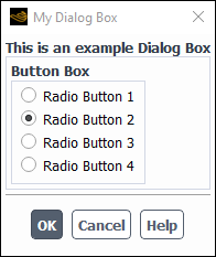 (define (apply-cb) #t) (define update-cb #f) (define radioButton1) (define radioButton2) (define radioButton3) (define radioButton4) (define my-dialog-box (cx-create-panel "My Dialog Box" apply-cb update-cb)) (define table (cx-create-table my-dialog-box "This is an example Dialog Box")) (define buttonBox (cx-create-button-box table "Button Box" 'radio-mode #t)) (set! radioButton1 (cx-create-toggle-button buttonBox "Radio Button 1")) (set! radioButton2 (cx-create-toggle-button buttonBox "Radio Button 2")) (set! radioButton3 (cx-create-toggle-button buttonBox "Radio Button 3")) (set! radioButton4 (cx-create-toggle-button buttonBox "Radio Button 4")) (cx-set-toggle-button radioButton2 #t) (cx-show-panel my-dialog-box)