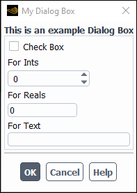 (define (apply-cb) #t) (define update-cb #f) (define table) (define checkbox) (define ints) (define reals) (define txt) (define my-dialog-box (cx-create-panel "My Dialog Box" apply-cb update-cb)) (set! table (cx-create-table my-dialog-box "This is an example Dialog Box")) (set! checkbox (cx-create-toggle-button table "Check Box" 'row 0)) (set! ints (cx-create-integer-entry table "For Ints" 'row 1)) (set! reals (cx-create-real-entry table "For Reals" 'row 2)) (set! txt (cx-create-text-entry table "For Text" 'row 3)) (cx-show-panel my-dialog-box)