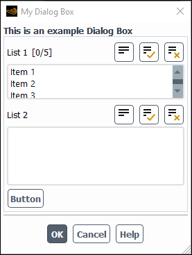 (define (apply-cb) #t) (define update-cb #f) (define table) (define myList1) (define myList2) (define (button-cb . args) (cx-set-list-items myList2 (cx-show-list-selections myList1)) (cx-set-list-selections myList2 (cx-show-list-selections myList1)) ) (define my-dialog-box (cx-create-panel "My Dialog Box" apply-cb update-cb)) (set! table (cx-create-table my-dialog-box "This is an example Dialog Box")) (set! myList1 (cx-create-list table "List 1" 'visible-lines 3 'multiple-selections #t 'row 0)) (cx-set-list-items myList1 (list "Item 1" "Item 2" "Item 3" "Item 4" "Item 5")) (set! myList2 (cx-create-list table "List 2" 'visible-lines 5 'multiple-selections #t 'row 1)) (cx-create-button table "Button" 'activate-callback button-cb 'row 2) (cx-show-panel my-dialog-box)