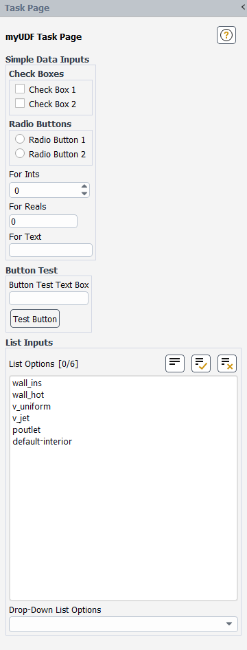This section contains the code for a task page that includes all of the features discussed in part two of this guide. This example can be used in conjunction with the UDF Example found later in this chapter in order to verify that the data is passed from the task page to the UDF using RP variables. This example contains comments in order to help readers understand the various parts of the example. All Scheme comment lines start with a semi-colon. This code automatically creates a menu called New Menu 2, with a submenu called New Submenu 2. The task page is automatically added as a menu item in New Submenu 2.