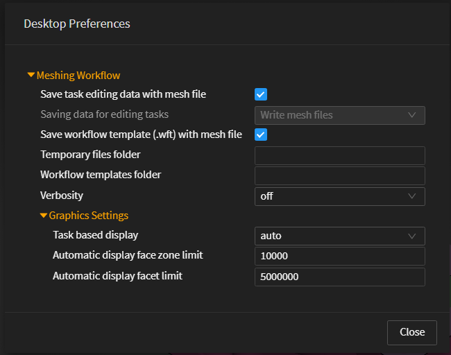 Fluent Meshing desktop-specific preferences for the workflows are available from the Main menu (
