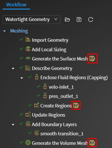 Similar to the desktop version of Fluent Meshing, several tasks contain an additional button that can appear alongside the task name in the workflow. This will allow you to toggle on or off the ability to save task editing files so the task can be more quickly restored to a previous state.