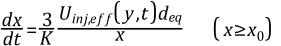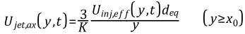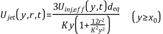 where x is jet tip penetration, y is the local spray-axial location of the particle, K is an entrainment constant, U inf,eff is the "effective injection velocity", d eq is the equivalent diameter which is related to nozzle diameterD and liquid-gas density ratio by: