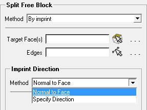 The By imprint option extends Imprint Face to include splitting the 3D block between source Edges and Target Face(s). The new, 3D block is converted to mapped (if all faces are mapped faces) or swept (if the block contains two matching free faces and all others are mapped).