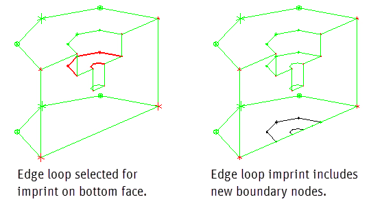 An example demonstrating the Imprint Face option with Normal to Face imprint direction is shown in Figure 351: Use of the Imprint Face Option.