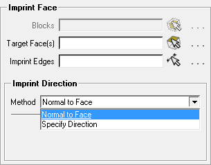 The default option will generally imprint the face/block using the normal of the imprinted face. However, for 3D blockings, if the source and target have side faces that directly connect them, these side faces will be used to compute the normal.