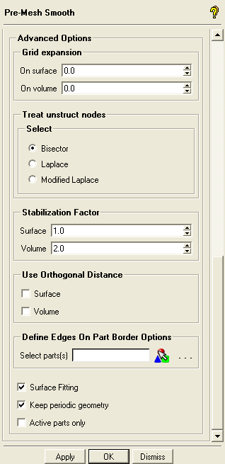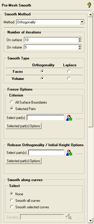 If Orthogonality is selected, then the smoother tries to retain orthogonality and the height of the first layer (a different height can be specified for different parts using Release Orthogonality / Initial Height Options). If Laplace is selected, the smoother tries to equalize the mesh by setting the control function