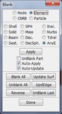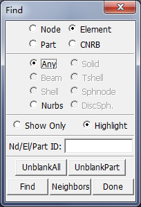 Use this interface to display the ID for any node, element, part, particle, constrained nodal rigid body (CNRB), or part_composite(_contact, tshell) in the model. The General Selection interface is used for entity selection.