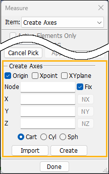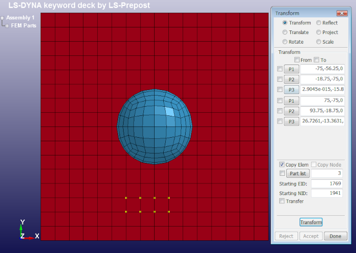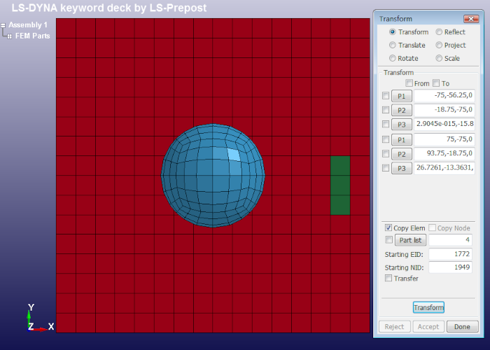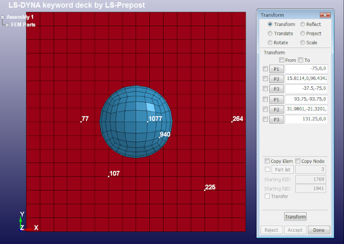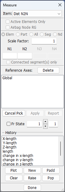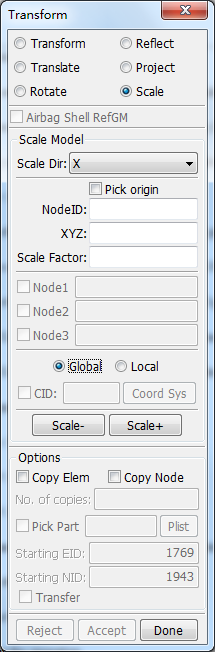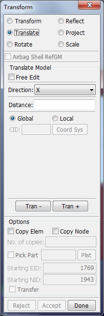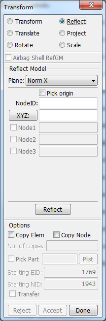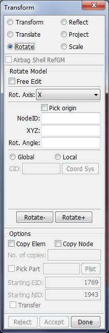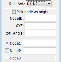 The rotation point, which is the same as the reference point, can optionally be changed to be at any nodal position by activating the Ref. node toggle and picking a node with the left mouse button or typing a node ID in the text field. The stresses and strains on the *INITIAL_STRESS_SHELL, *INITIAL_STRAIN_SHELL, and *INITIAL_STRESS_SOLID keywords are automatically rotated to follow the rotation of the elements in the moving parts.