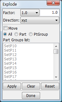 This interface is used to explode/separate parts so that they can be viewed more easily. The amount of explosion can be varied by changing the factor or entering a factor in the text widget for Factor. By default the exploding of view is done in x, y, and z axes. This can be changed to only x, y, z, xy, yz, zx or xyz directions. Exploding by default is applied to all parts. This can be limited to selected parts or a group of parts. Part groups will be listed under Part Groups list if groups have been defined already. Groups can be defined using the Group Interface. Exploded display settings will be retained upon exiting the Explode interface unless cleared by Reset.