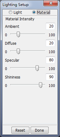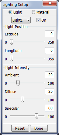 3 types of lighting models are available: Ambient, Diffuse, and Specular. The position of light sources and their intensity can be modified to achieve the desired effects. By default, two lights are turned on. Additional lights can be turned on/off as desired.