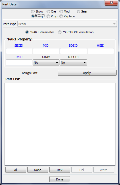 Edit part property with Part Property Dialog, include "Modify part", "Assign part" and "Edit part data".