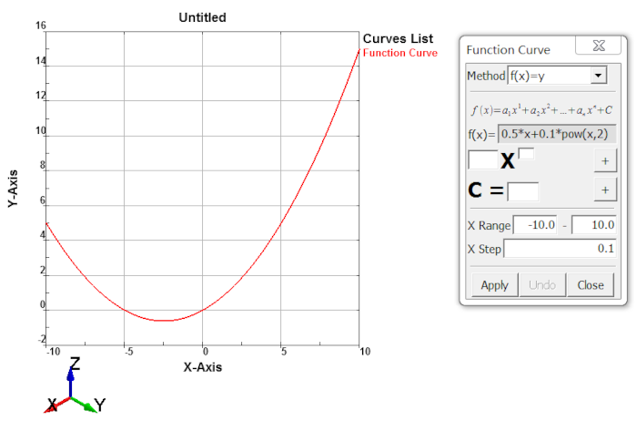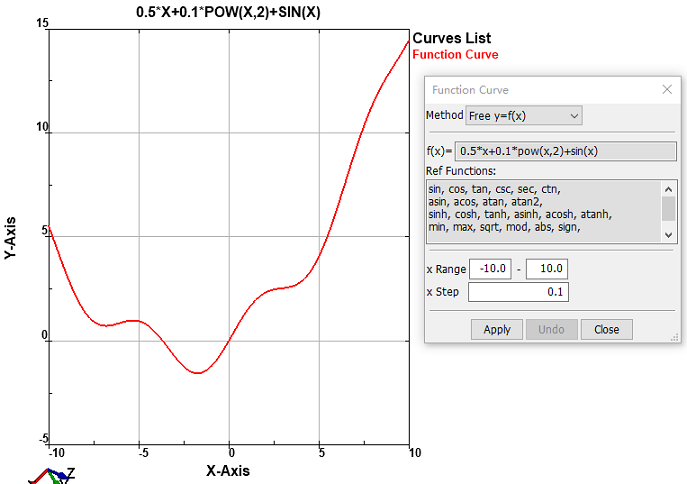 To create a function curve: Click Function (Curve toolbar) or click Geometry, Curve, Function.