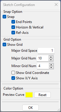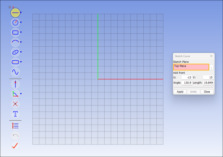 In the dialog, select a sketch plane firstly. Next, choose the specified sketch type. Sketch types contain: Line, Circle, Rectangle, Arc, Conic Curves, Slot, B-spline Curve, Curve Cut, Transform, Delete, Configuration, Undo and Apply. You can input point's coordinates in U and V text control, and press Enter to input a sketch point. To input next point by angle and length relative to last point, enter values into "Angle" and "Length".