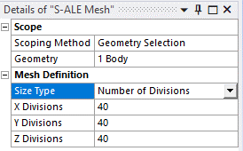 An alternative method is to insert an S-ALE Mesh object under the Model branch. This object can be scoped to the S-ALE Domain body, and either the element size or the number of divisions along each co-ordinate axis can be defined directly. The object also provides a visual representation of the mesh on the exterior surface of the body.