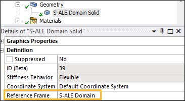 This Outcome scopes the S-ALE domain of the S-ALE Mesh operation. When the mesh workflow is completed, the S-ALE domain is added to the geometry and the Reference Frame property is automatically set to S-ALE Domain.