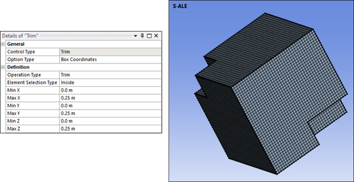 Defines the trim operations for the S-ALE mesh. The input parameters capture the information used in the *ALE_STRUCTURED_MESH_TRIM card, as described in the LS-DYNA Keyword Manual Vol I. Multiple trim cards can be added, and are applied sequentially by the solver.